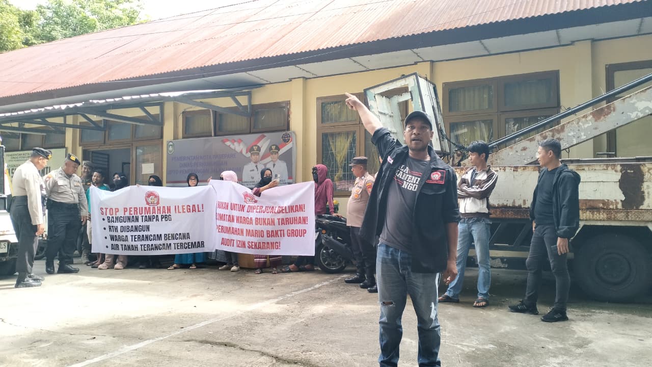 Perwakilan LSM Pakar, Tenry Wara, dalam orasinya mendesak pemerintah bertindak tegas terhadap pengembang, Mario Bakti Group, atas dugaan pelanggaran perizinan dan tata ruang.