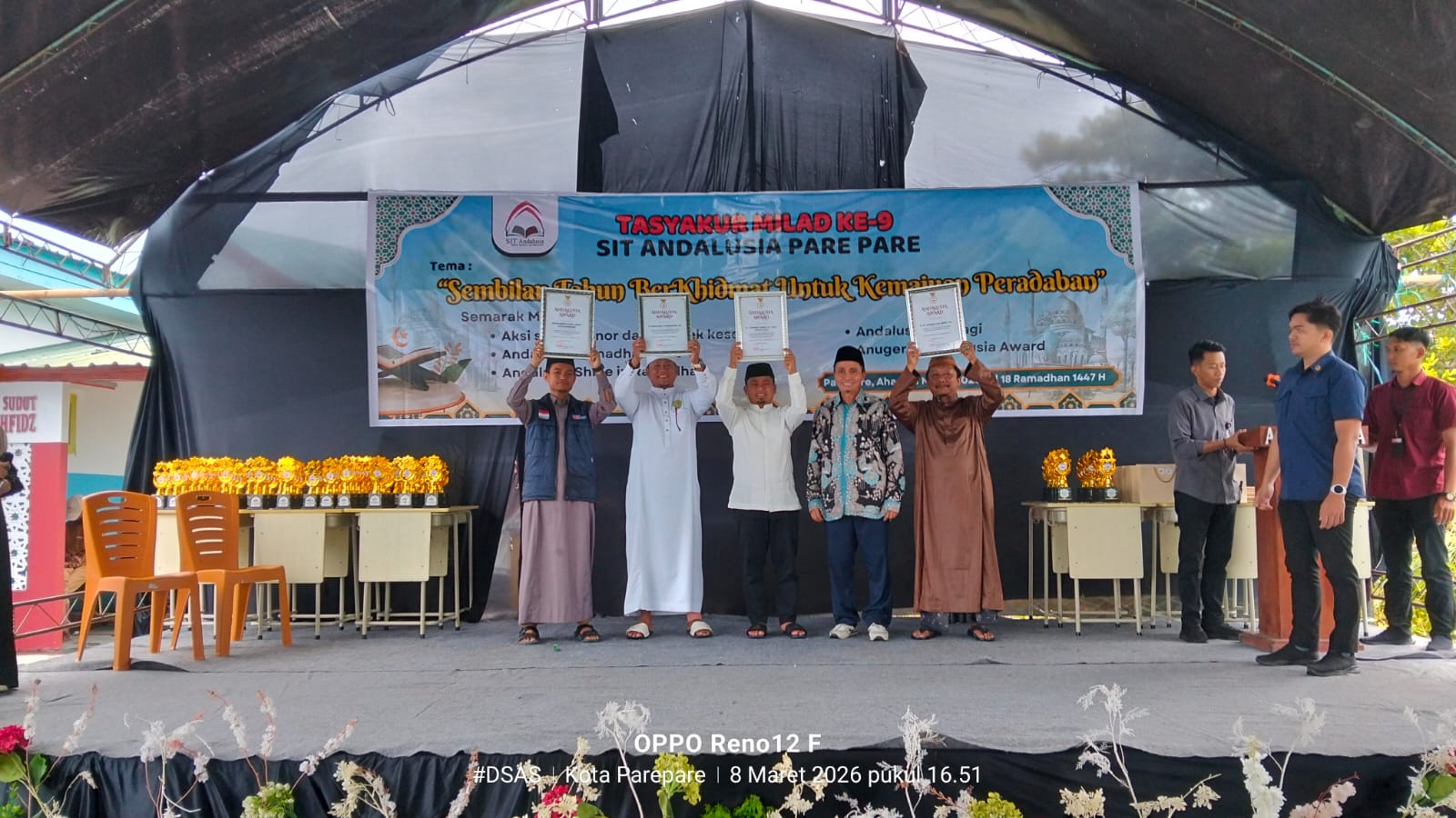 Muassis Majelis Syuhada yang diwakili oleh Ustaz Sumardi M. Omar hadir menerima penghargaan tersebut dari Direktur Andalusia Institute HA Abd Rahman Saleh pada momentum Tasyakuran Milad ke-9 Sekolah Islam Terpadu Andalusia Parepare, Ahad (8/3/2026).