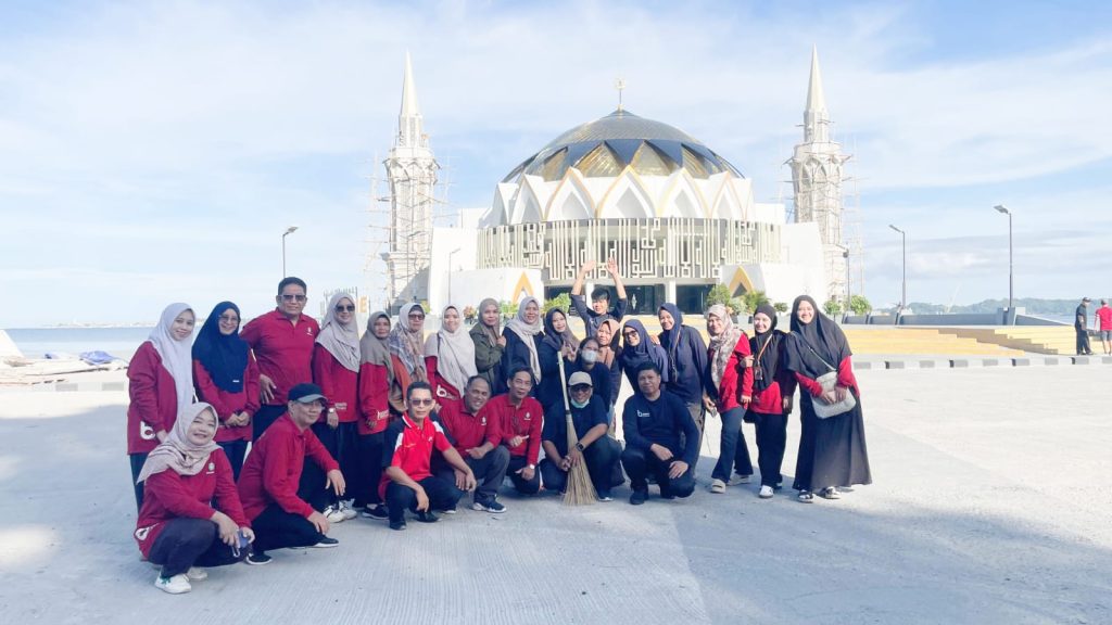 Jajaran Bappeda yang mengenakan kostum “menyala” kaos seragam berwarna merah maroon kompak dan semangat membersihkan sampah di bibir pantai dan pelataran Masjid Terapung BJ Habibie. Setiap sampah yang terkumpul diangkut oleh armada truk sampah Dinas Lingkungan Hidup (DLH) yang siaga di lokasi.