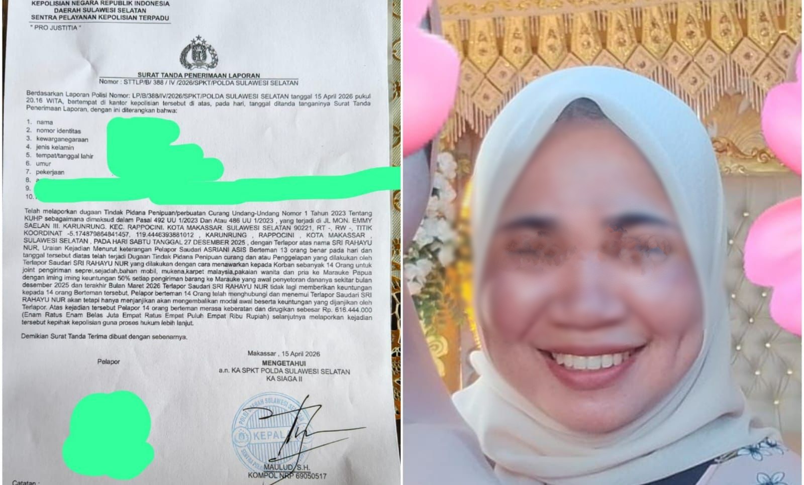 Laporan tersebut tertuang dalam Surat Tanda Penerimaan Laporan (STTLP) Nomor STTLP/B/388/IV/2026/SPKT/Polda Sulawesi Selatan yang diterbitkan pada 15 April 2026.